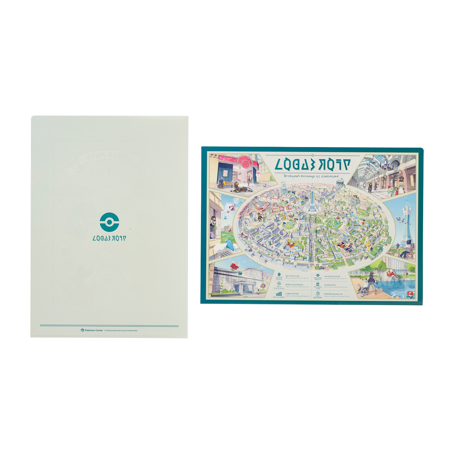 1枚目は、表が昼にポケモンたちと「ワイルドゾーン」で冒険する主人公と、夜の「バトルゾーン」で、デウロとピュールとZAロワイヤルに参加している主人公とポケモンたちといった、昼夜のミアレシティが描かれているアートで、裏がミアレシティのMAPになったデザイン。