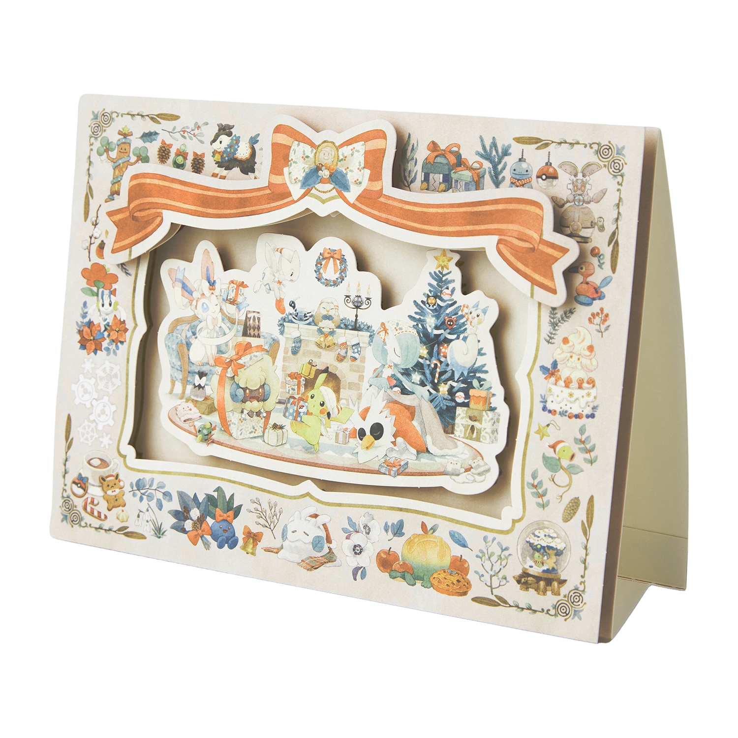 疲れて眠っちゃったデリバードと、お手伝いに来たポケモンたちがデザインされた立体的なメッセージカードだよ♪