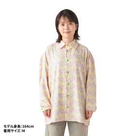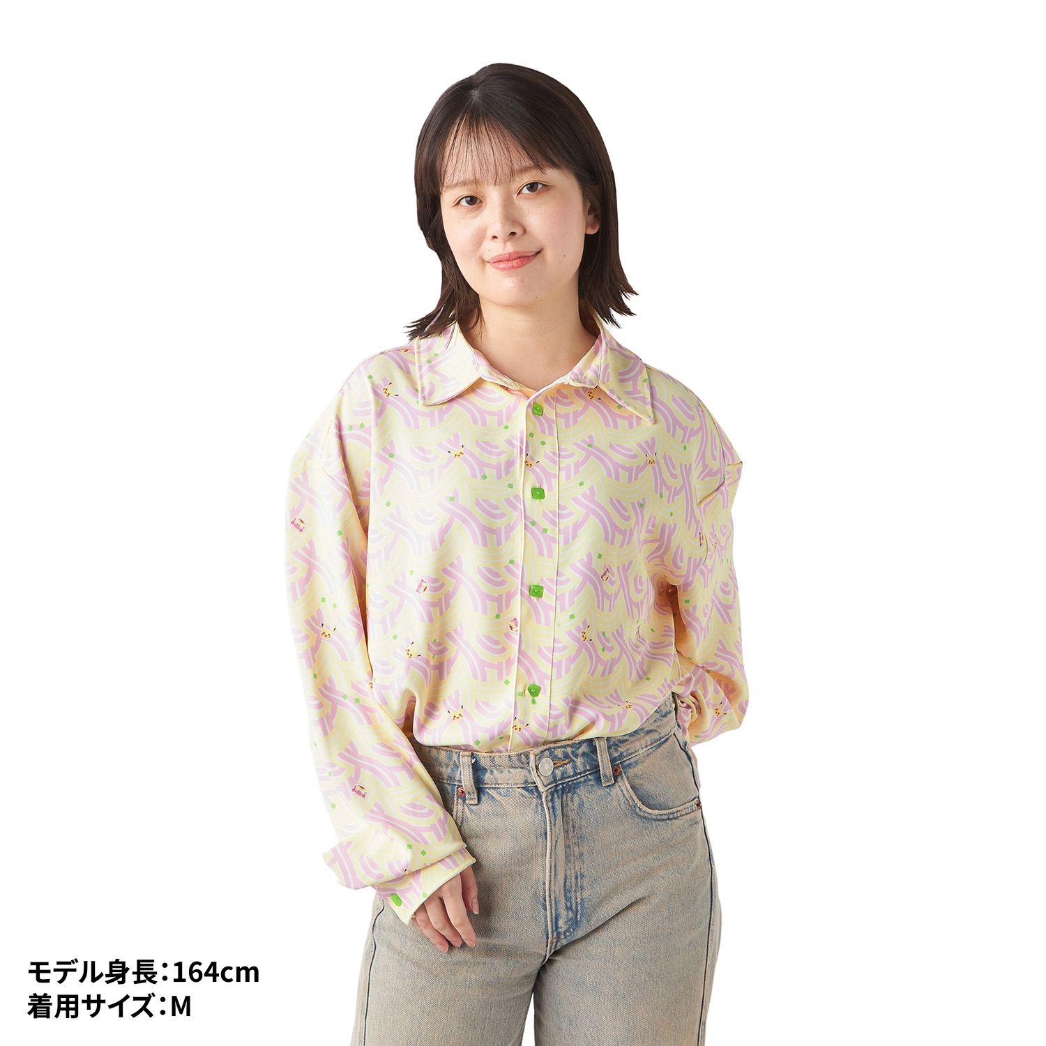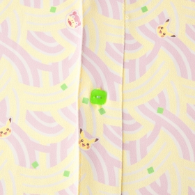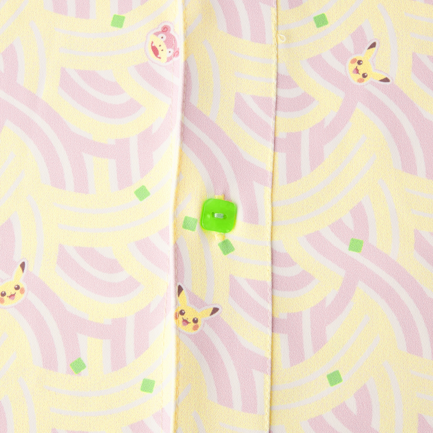 うどん柄にヤドンとピカチュウのかまぼこがデザインされていて、ボタンはネギの形になっている長袖シャツだよ。
