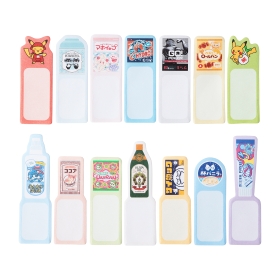 ピカピカマートのふせんセットだよ。お買い物カゴ風の台紙に、カラフルな商品パッケージ風のふせんがたくさん付いているよ!