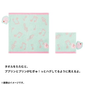 タオルをたたむと、ププリンとプリンがむぎゅ!っとハグしてるように見えるジャガード織りのハンドタオルだよ!