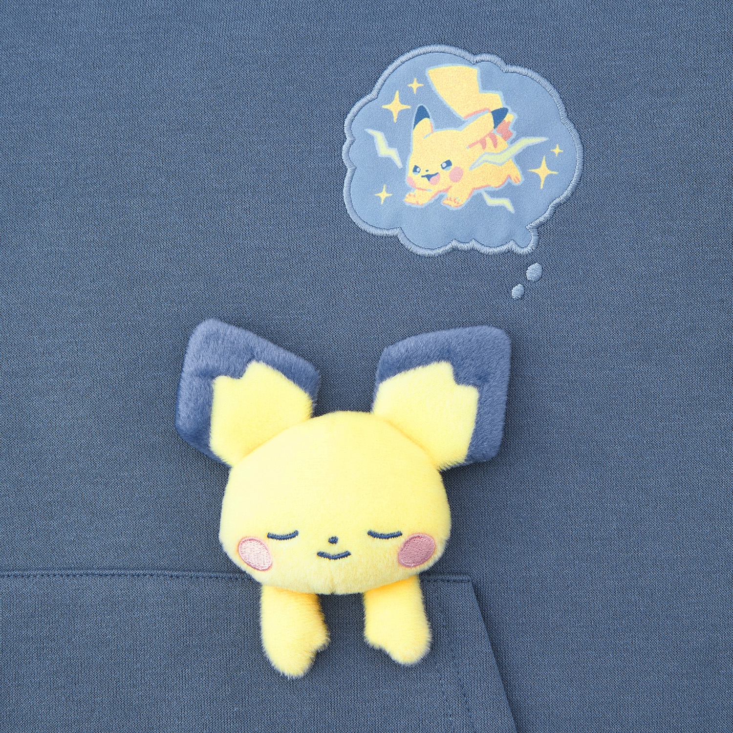 遊び疲れて、うとうと夢の中♪ピカチュウの夢を見るピチューの、マスコット付きパーカーだよ!