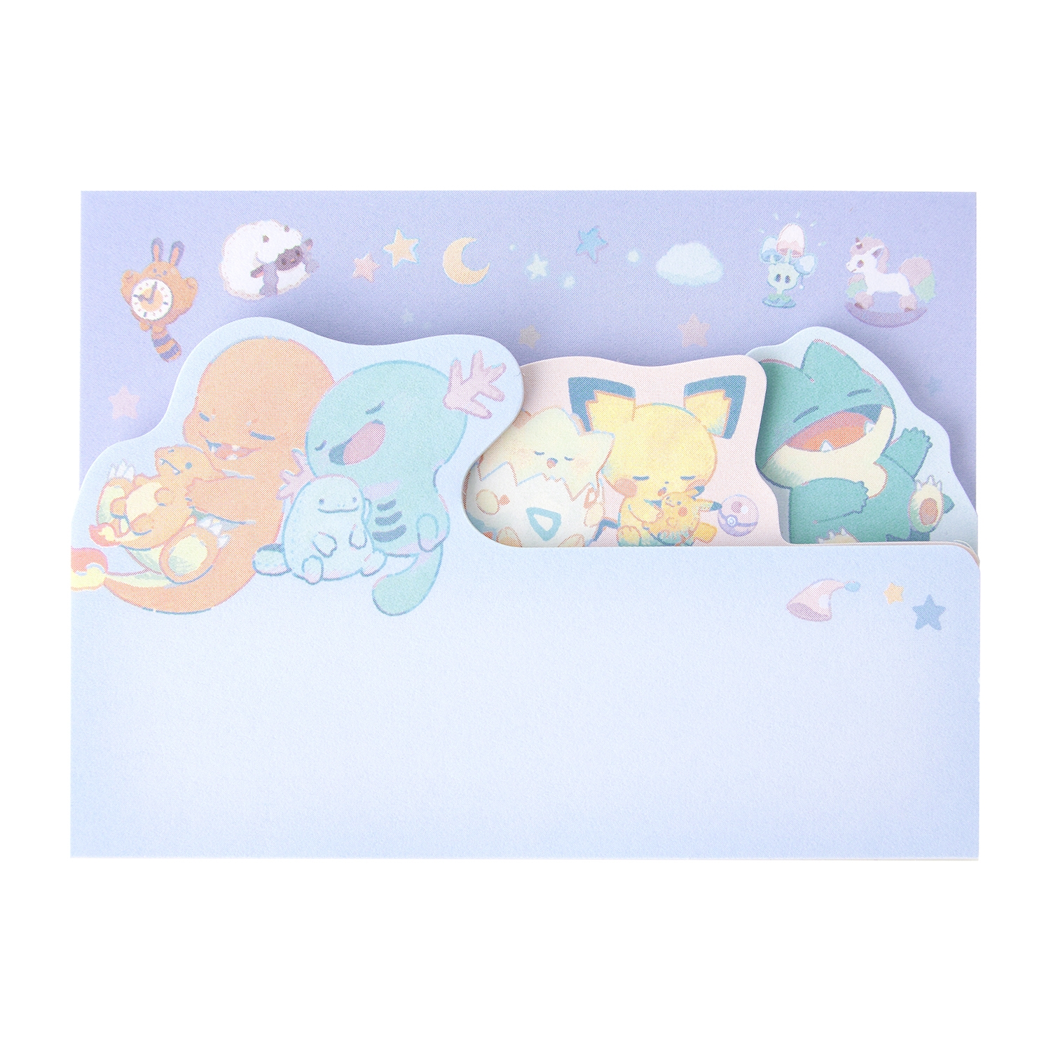 トレーナーからもらったお気に入りのぬいぐるみと一緒に過ごすポケモンたちを描いた、ダイカットブロックふせんだよ!