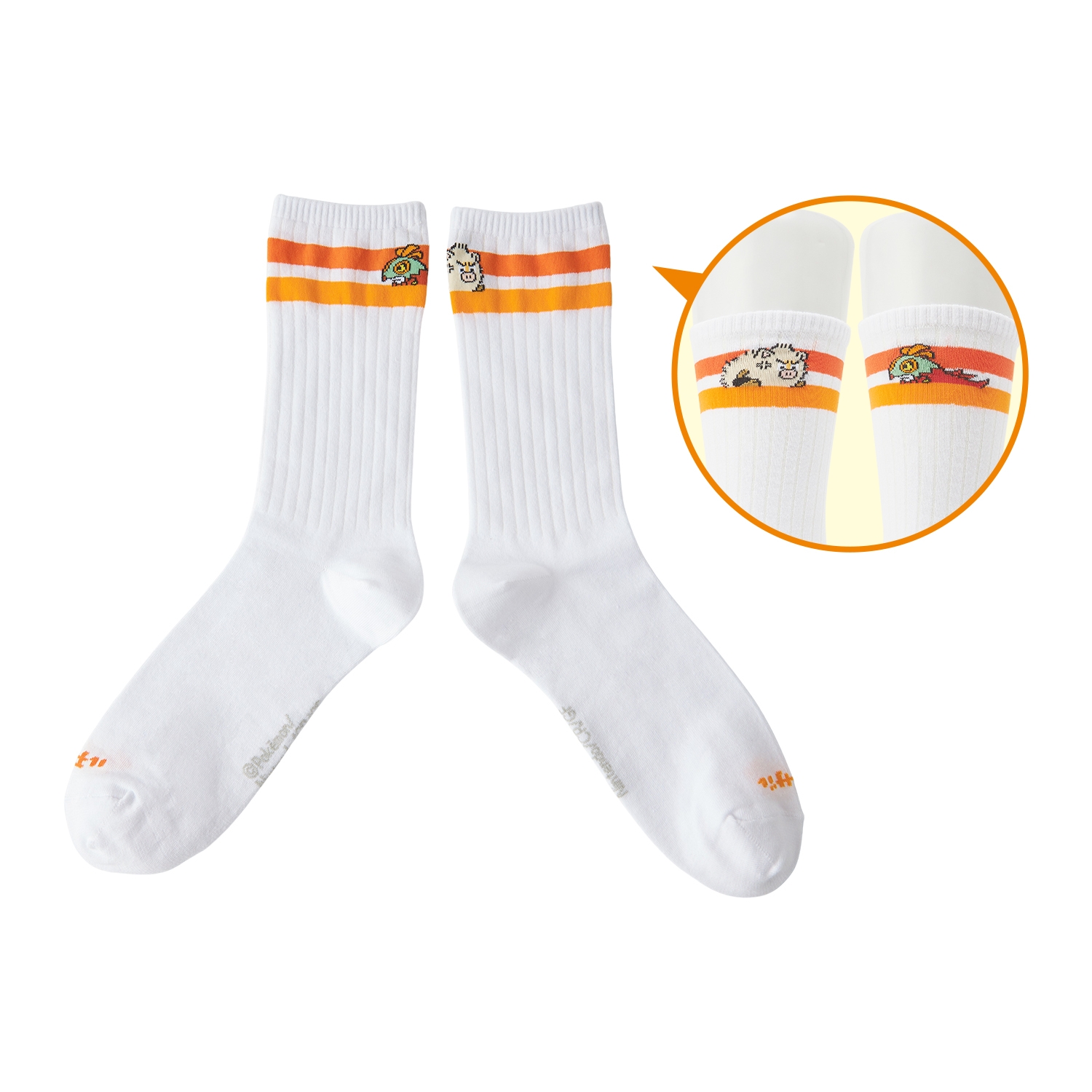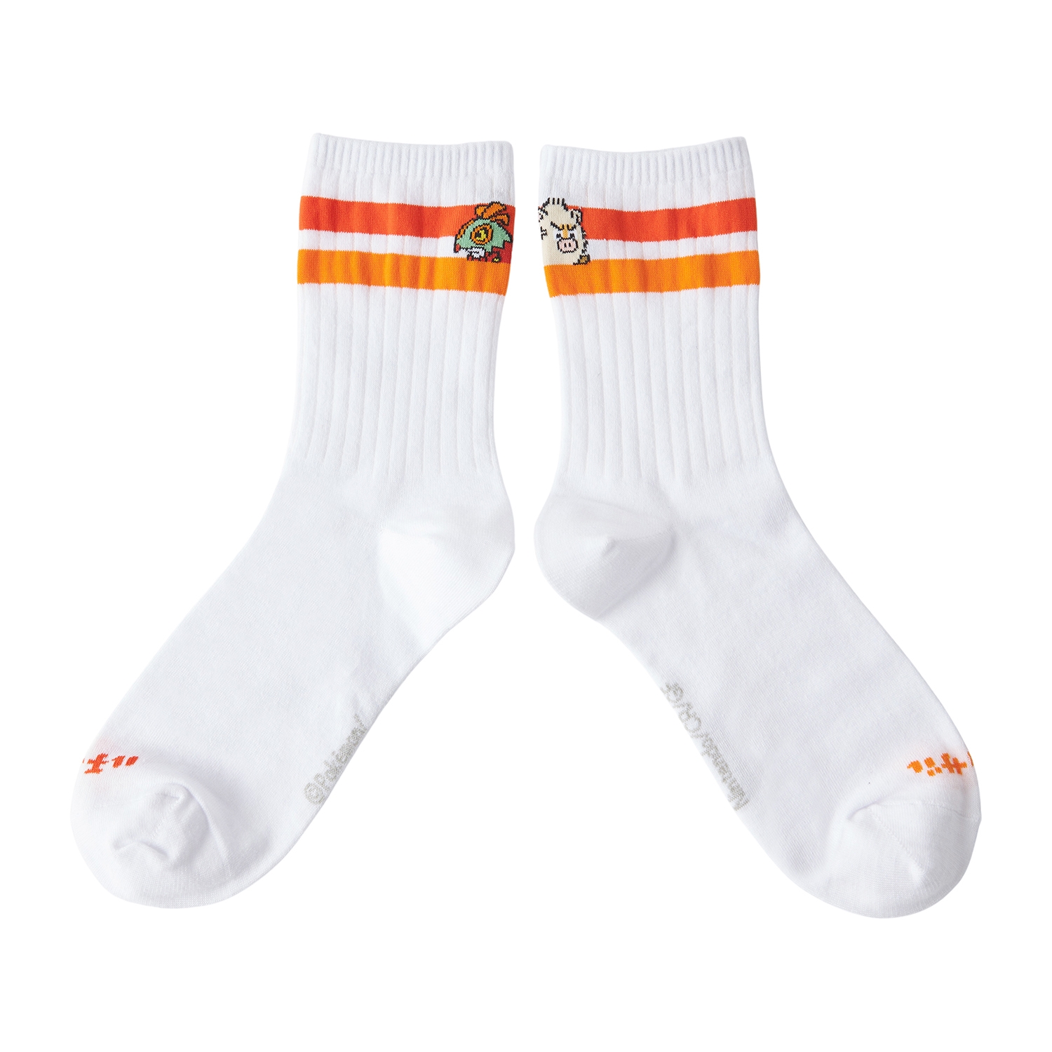 左右でデザインが異なる、天敵同士のオコリザルとルチャブルのラインソックスだよ!
