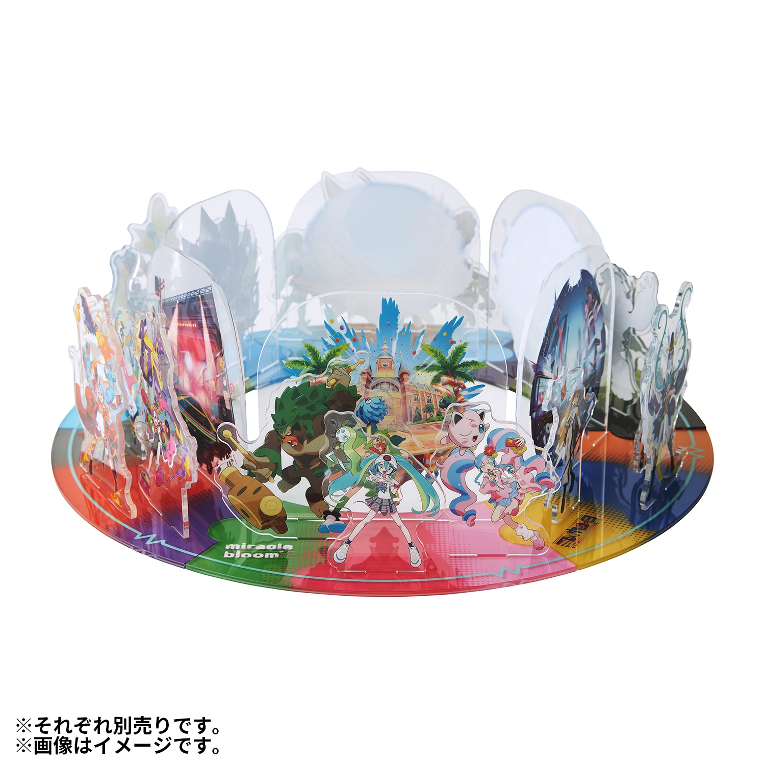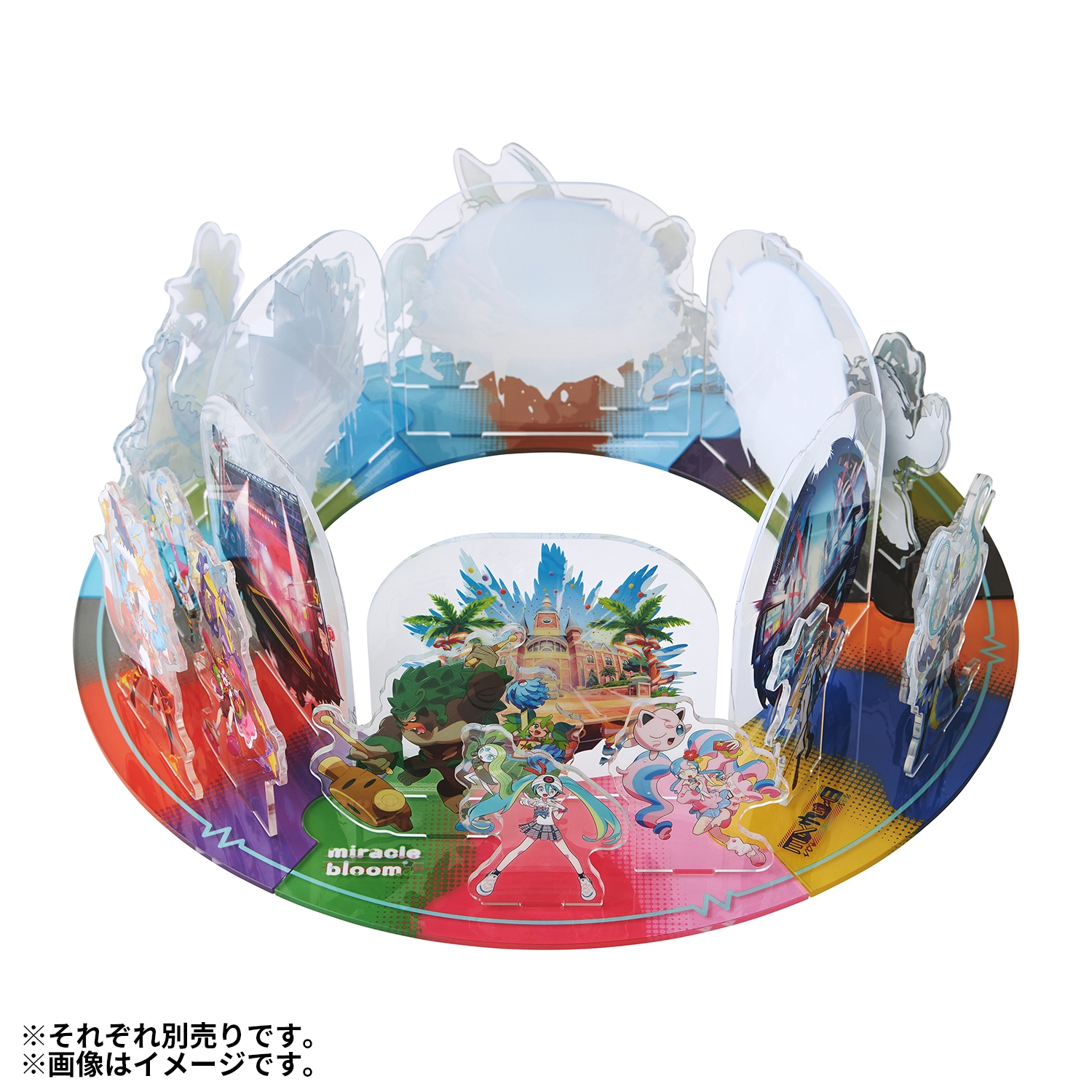 18タイプの初音ミクと相棒ポケモンのアクリルスタンドコレクションだよ!全種類を集めると、円につなげて大きなステージを再現できるよ!