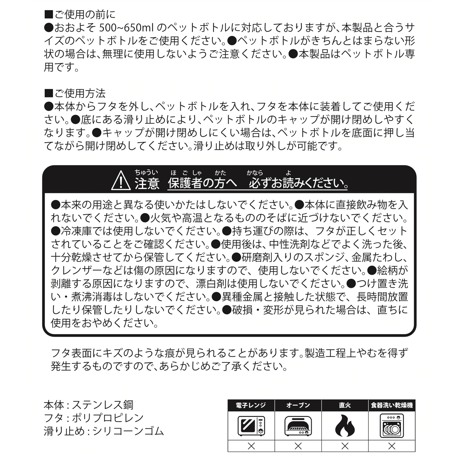 ※おおよそ500ml~650mlのペットボトルに対応しておりますが、本製品と合うサイズのペットボトルをご使用ください。