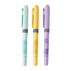 クリア素材のペンケースとマーカーセットだよ。マーカーはイエロー、ブルー、パープルの3本入り。