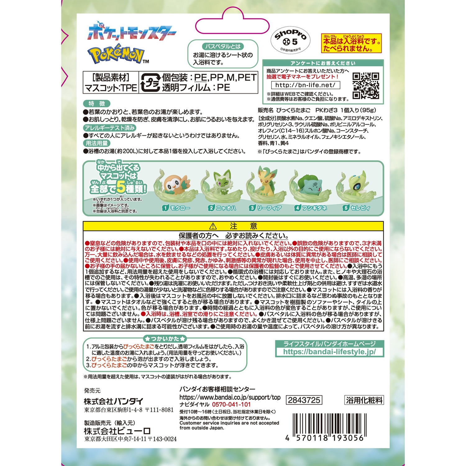 入浴料を溶かすと、若葉色の湯面にまるで「マジカルリーフ」のように葉っぱ型のバスペタルが散っていき、マスコットが1つ出てくるよ。