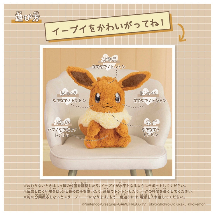 おでこ、ほっぺ、あご、おなかをなでたり、トントンするとイーブイが声でリアクション!