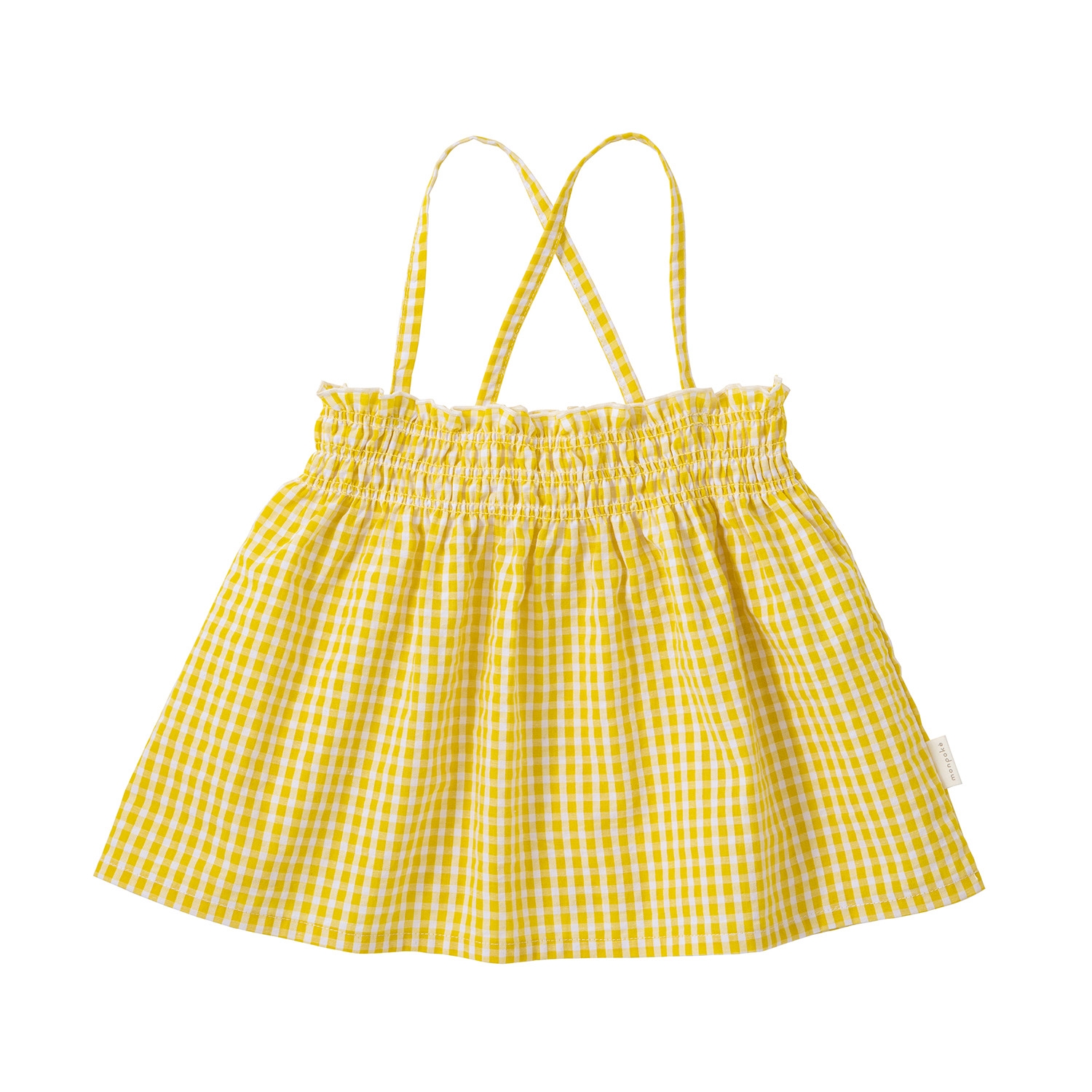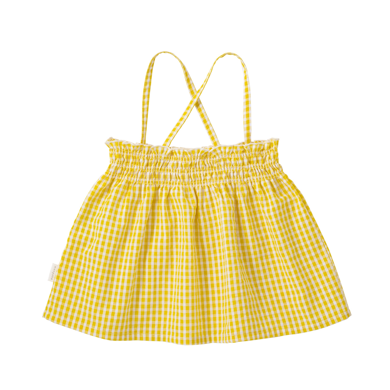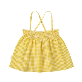ギンガムチェック生地のキャミソールワンピースとネップ天竺の半袖ロンパースのセット。