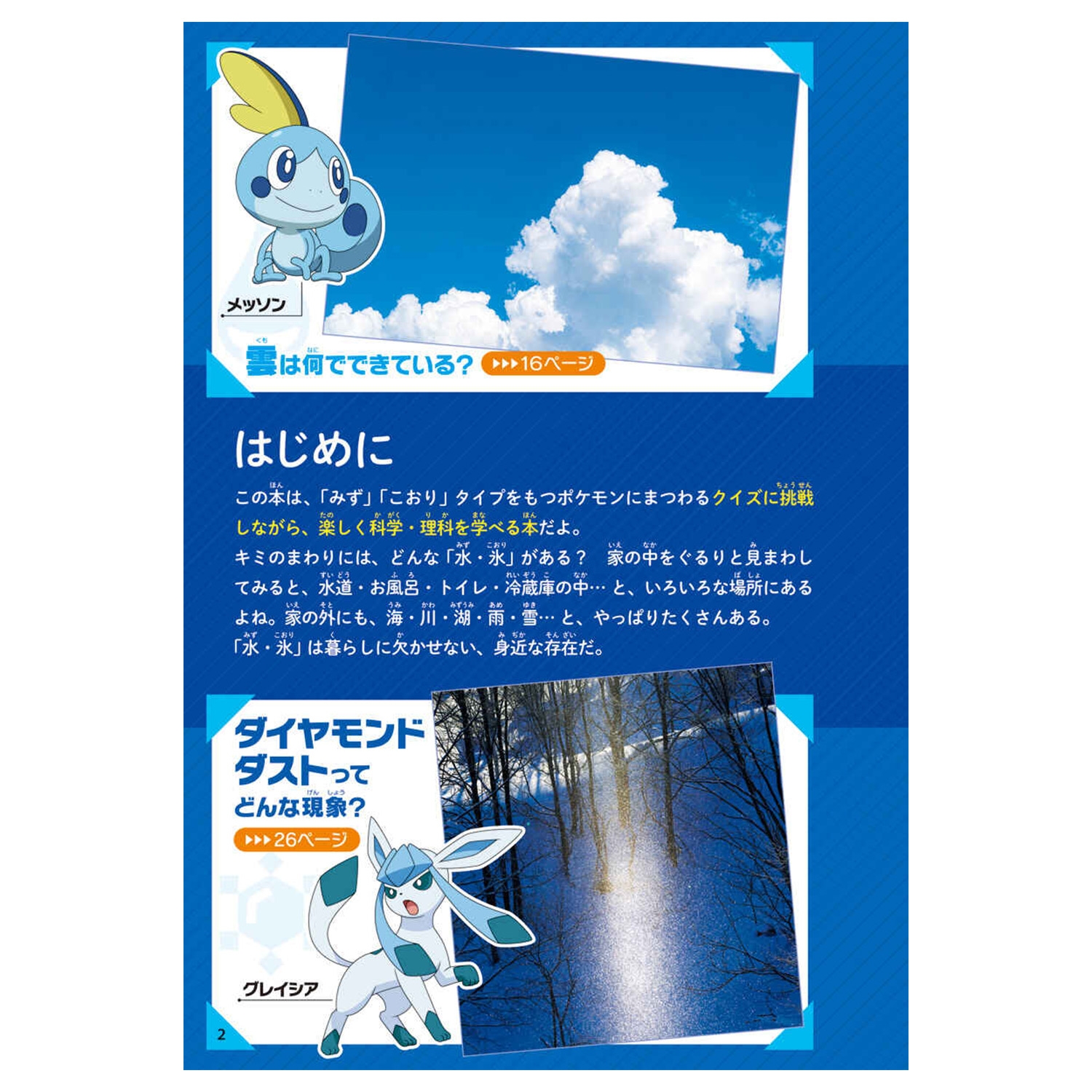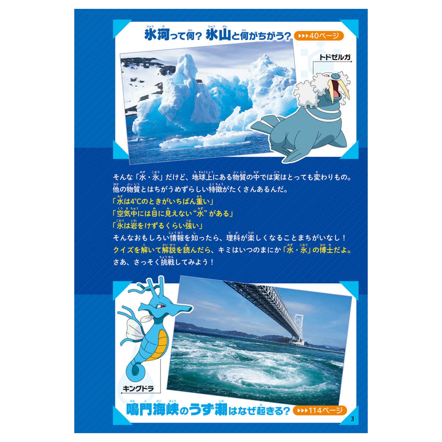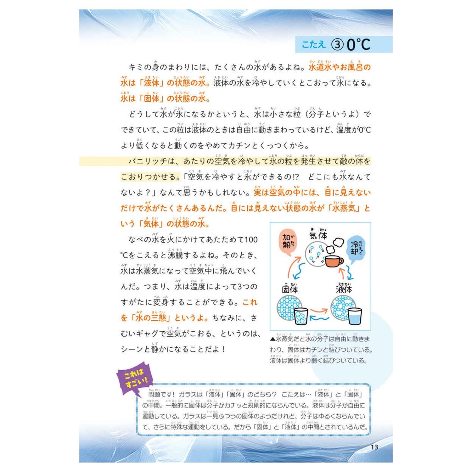 「みず・こおり」では「水は何度で氷になる?」「氷は水にうく?うかない?」など科学の知識をクイズ形式で紹介。