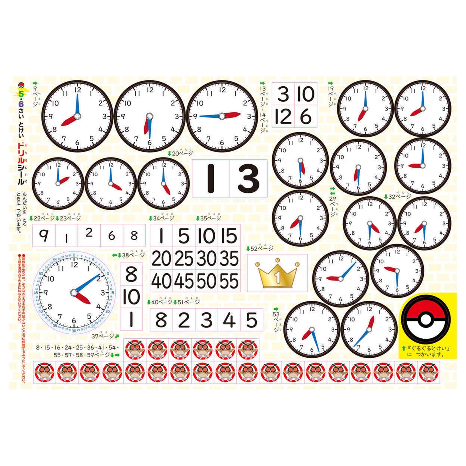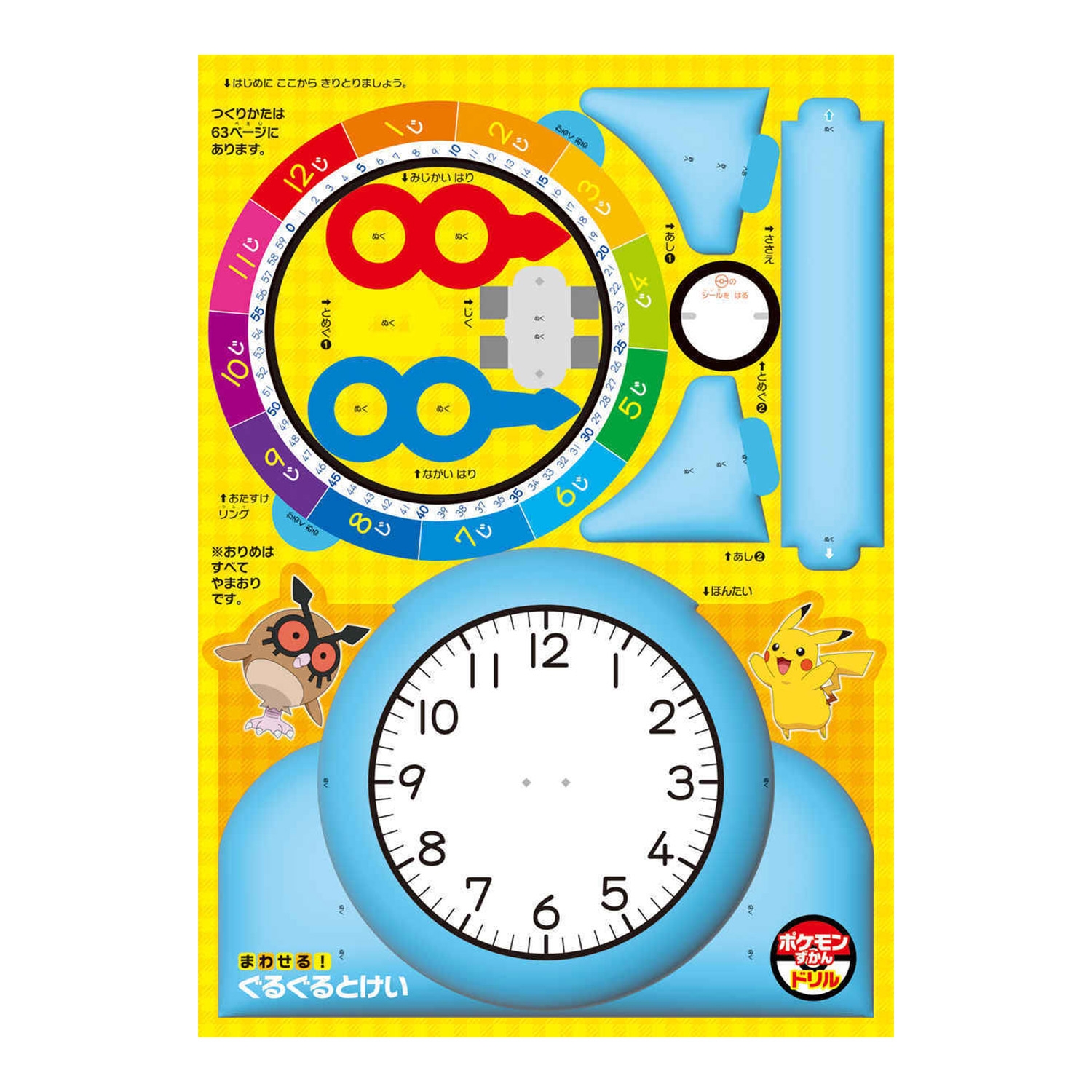 キラキラのポケモンシールに加え、特別教材として、学習用ドリルシール、簡易組み立て「まわせる! ぐるぐるとけい」も付いているよ。