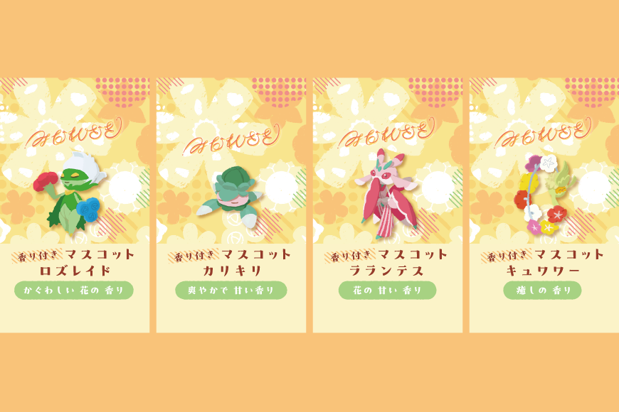 ロズレイドやカリキリたちの香り付きマスコットは、それぞれのポケモンたちをイメージした香りが楽しめるよ。